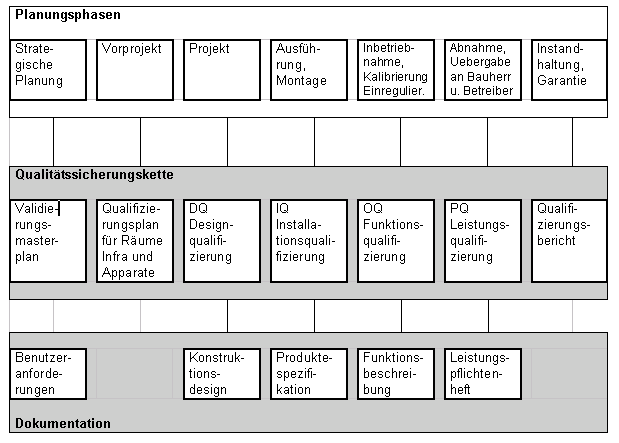 Damit das Qualitätsziel, nämlich eine zuverlässige, gleichbleibende und reproduzierbare Qualität garantiert werden kann, muss während sämtlichen Planungs- und Ausführungsphasen diese Qualität bei den Verfahren, den Anlagen, der Infrastruktur und den Ausgangsstoffen gesichert werden.
